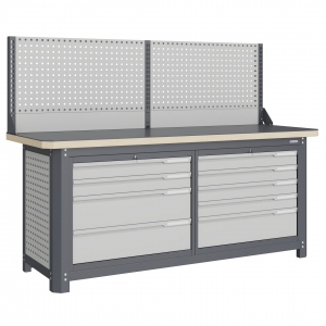 Экран (перфорированная панель) верстака выполнен с квадратной перфорацией 12х12 мм с шагом 38 мм для установки крючков, держателей и других аксессуаров. Экран крепятся к столешнице с помощью специальных кронштейнов. Максимальная масса груза, равномерно распределенного по поверхности экрана, составляет 71 кг.