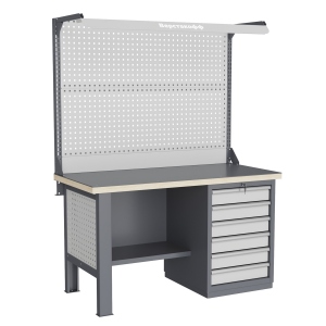 Верстак может комплектоваться одинарным или двойным перфорированным экраном, электромонтажным блоком для установки розеток и дополнительных устройств, а также комплектом освещения с держателем и лампой. Перфорация экрана подходит под стандартные держатели для инструментов, отверток, крючков, полок. Возможна комплектование верстака навесным элементами (держатели, крючки, полки).