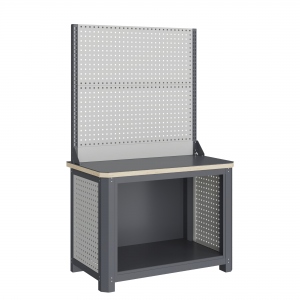 Экран (перфорированная панель) верстака выполнен с квадратной перфорацией 12х12 мм с шагом 38 мм для установки крючков, держателей и других аксессуаров. Экран крепятся к столешнице с помощью специальных кронштейнов. Максимальная масса груза, равномерно распределенного по поверхности экрана, составляет 71 кг.