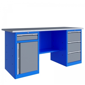 Тумбы верстаков выполнены сварными. Ящики в тумбах устанавливаются на шариковых телескопических направляющих полного выдвижения. В тумбе P3 установлено три больших ящика. Внутренние размеры больших ящиков (ВхШхГ), не более: 222 х 397 х 520 мм. Тумбы с ящиками снабжены общим центральным замком с поворотом ригеля 180 градусов и подпружиненной тягой. В тумбе P8 установлен малый ящик и имеется отделение с дверью и одной полкой. Внутренние размеры малых ящиков (ВхШхГ), не более: 103 х 397 х 520 мм. Ящик снабжен центральным замком с поворотом ригеля 180 градусов и подпружиненной тягой. Полка устанавливается на парах специальных формованных зацепов, выполненных в боковых стенках тумбы. Имеется возможность смены стороны открывания двери. Дверь тумбы снабжена центральным замком с поворотом ригеля 180 градусов. В комплекте имеется два ключа с каждым замком.