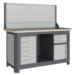 Экран (перфорированная панель) верстака выполнен с квадратной перфорацией 12х12 мм с шагом 38 мм для установки крючков, держателей и других аксессуаров. Экран крепятся к столешнице с помощью специальных кронштейнов. Максимальная масса груза, равномерно распределенного по поверхности экрана, составляет 71 кг.