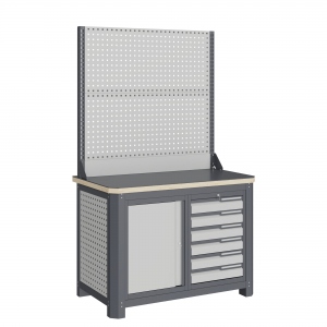 Экран (перфорированная панель) верстака выполнен с квадратной перфорацией 12х12 мм с шагом 38 мм для установки крючков, держателей и других аксессуаров. Экран крепятся к столешнице с помощью специальных кронштейнов. Максимальная масса груза, равномерно распределенного по поверхности экрана, составляет 71 кг.