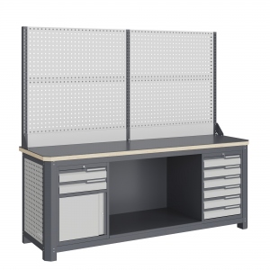 Экран (перфорированная панель) верстака выполнен с квадратной перфорацией 12х12 мм с шагом 38 мм для установки крючков, держателей и других аксессуаров. Экран крепятся к столешнице с помощью специальных кронштейнов. Максимальная масса груза, равномерно распределенного по поверхности экрана, составляет 71 кг.