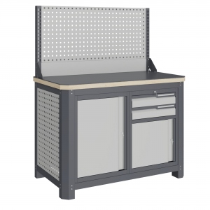 Экран (перфорированная панель) верстака выполнен с квадратной перфорацией 12х12 мм с шагом 38 мм для установки крючков, держателей и других аксессуаров. Экран крепятся к столешнице с помощью специальных кронштейнов. Максимальная масса груза, равномерно распределенного по поверхности экрана, составляет 71 кг