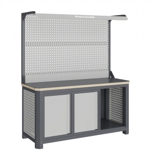Экран (перфорированная панель) верстака выполнен с квадратной перфорацией 12х12 мм с шагом 38 мм для установки крючков, держателей и других аксессуаров. Экран крепятся к столешнице с помощью специальных кронштейнов. Максимальная масса груза, равномерно распределенного по поверхности экрана, составляет 71 кг.