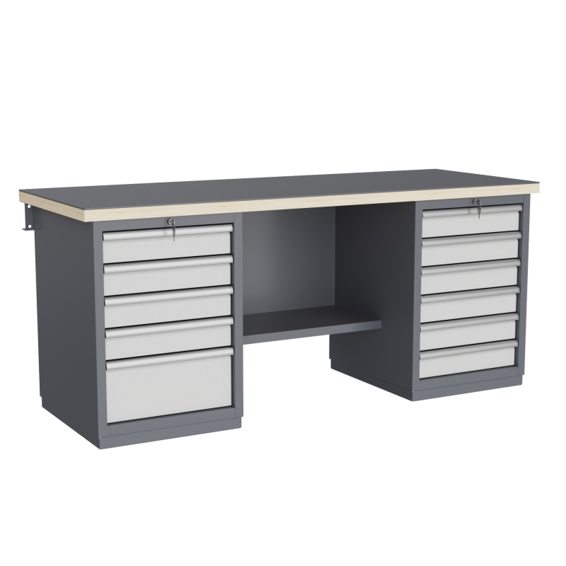 Тумбы и опоры верстаков выполнены из профилированной холоднокатаной стали и имеют сварную конструкцию. Возможна установка любых сочетаний тумб с различным количеством выдвижных ящиков, а также с дверцей и полками. Между тумбами и опорами возможна установка полки-стенки. На каждой ручке ящика и двери закреплен специальный алюминиевый профиль с отделением для установки маркировки. На тумбы с выдвижными ящиками установлена система антиопрокидывания, которая ограничивает выдвижение остальных ящиков тумбы, если один из ящиков выдвинут. Ящики снабжены специальными усиленными шариковыми направляющими. Тумбы снабжены центральной системой запирания.