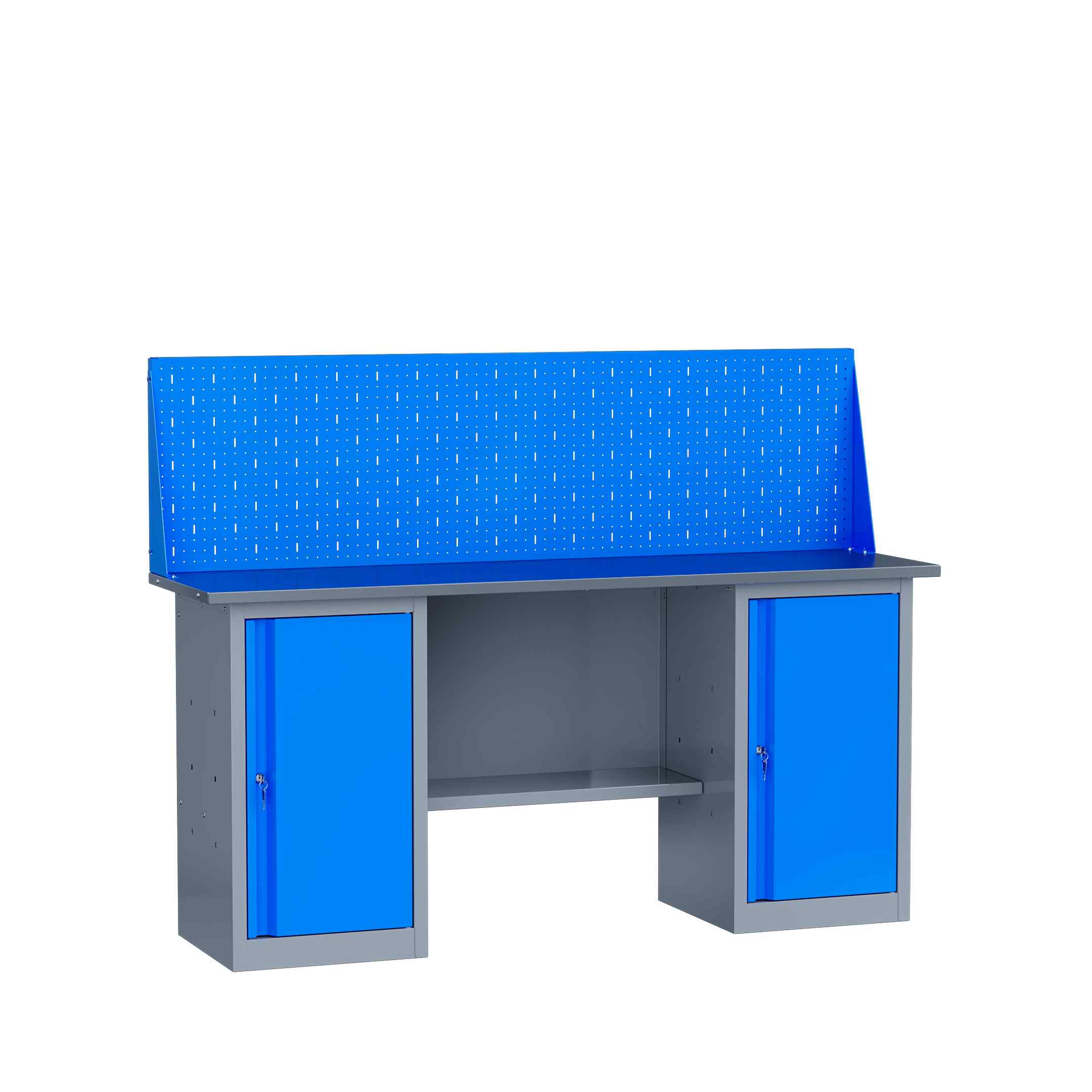 Столешница верстака закреплена на двух вместительных тумбах с дверцами. Тумбы оснащены полками, на которых можно хранить рабочие инструменты, запасные детали и материалы. Для надёжной сохранности инвентаря и деловой документации на дверцах предусмотрена возможность закрепления замочка.