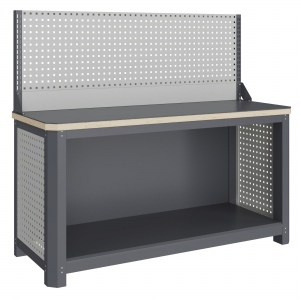 Экран (перфорированная панель) верстака выполнен с квадратной перфорацией 12х12 мм с шагом 38 мм для установки крючков, держателей и других аксессуаров. Экран крепятся к столешнице с помощью специальных кронштейнов. Максимальная масса груза, равномерно распределенного по поверхности экрана, составляет 71 кг.