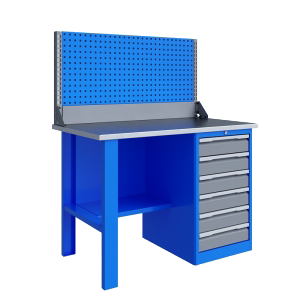 Верстак серии Technic 121.16.1-1 состоит из столешницы шириной 1196 мм, опоры, тумбы P6 с шестью малыми ящиками, полки-стенки и одинарного экрана с кронштейнами.