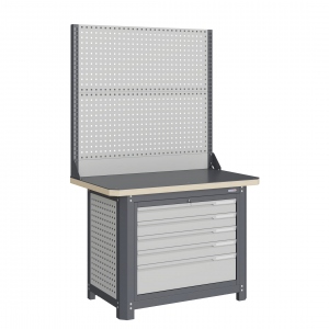 Верстак серии MECHANIC: MCN 1252.L5-2 состоит из столешницы шириной 1193 мм, рамы верстака, состоящей из опор, перемычек, боковых перфопанелей, большого модуля L5, двойного экрана с кронштейнами.