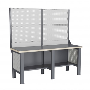 Верстак может комплектоваться одинарным или двойным перфорированным экраном, электромонтажным блоком для установки розеток и дополнительных устройств, а также комплектом освещения с держателем и лампой. Перфорация экрана подходит под стандартные держатели для инструментов, отверток, крючков, полок. Возможна комплектование верстака навесным элементами (держатели, крючки, полки).