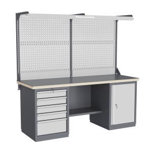 Верстак может комплектоваться одинарным или двойным перфорированным экраном, электромонтажным блоком для установки розеток и дополнительных устройств, а также комплектом освещения с держателем и лампой. Перфорация экрана подходит под стандартные держатели для инструментов, отверток, крючков, полок. Возможна комплектование верстака навесным элементами (держатели, крючки, полки).