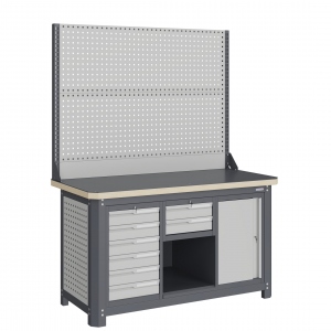 Экран (перфорированная панель) верстака выполнен с квадратной перфорацией 12х12 мм с шагом 38 мм для установки крючков, держателей и других аксессуаров. Экран крепятся к столешнице с помощью специальных кронштейнов. Максимальная масса груза, равномерно распределенного по поверхности экрана, составляет 71 кг.