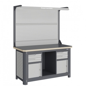 Экран (перфорированная панель) верстака выполнен с квадратной перфорацией 12х12 мм с шагом 38 мм для установки крючков, держателей и других аксессуаров. Экран крепятся к столешнице с помощью специальных кронштейнов. Максимальная масса груза, равномерно распределенного по поверхности экрана, составляет 71 кг.