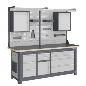Экран (перфорированная панель) верстака выполнен с квадратной перфорацией 12х12 мм с шагом 38 мм для установки крючков, держателей и других аксессуаров. Экран крепятся к столешнице с помощью специальных кронштейнов. Максимальная масса груза, равномерно распределенного по поверхности экрана, составляет 71 кг.
